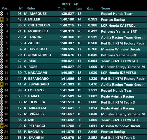 On retrouve Danilo Petrucci en 12e position, Fabio Quartararo juste derrière et précédant Jorge Lorenzo, Álex Rins à la 17e place, Valentino Rossi 20e et Cal Crutchlow 21e.