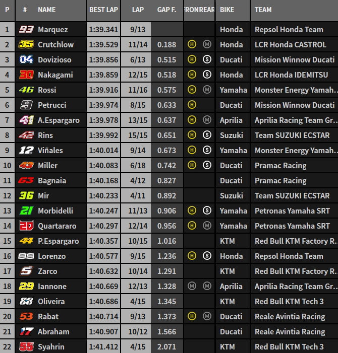À la mi-séance, la hiérarchie est composée de Cal Crutchlow en 1’39.808, devant Andrea Dovizioso, Takaaki Nakagami, Valentino Rossi, Jack Miller, Maverick Viñales, Francesco Bagnaia, Álex Rins, Joan Mir et Franco Morbidelli.