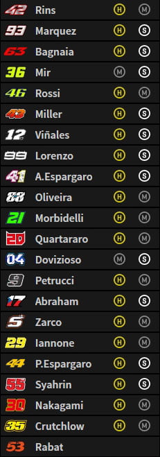 À l’exception d’Andrea Dovizioso et de Joan Mir, une unanimité se fait sur le choix du pneu avant dur alors qu’à l’arrière, l’indécision est plus grande entre médium et soft.