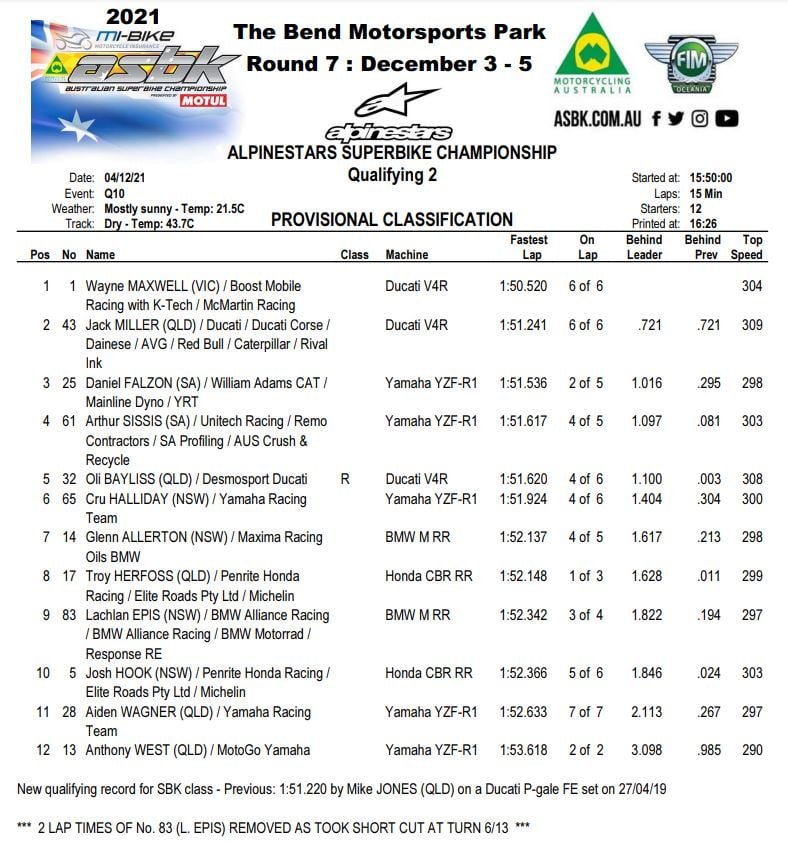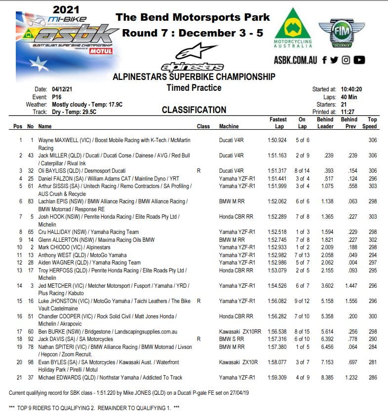 Le pilote MotoGP a perdu l’avant et a glissé hors du circuit, mais a rapidement récupéré sa moto et est retourné dans la voie des stands. Ce temps-là lui garantissait une qualification directe en Q2. Le record du tour en qualification à The Bend avait été établi en 2019 par Mike Jones, mais le pilote du Team DesmoSport Ducati n’est pas présent à l’événement en raison de son choix de ne pas se faire vacciner. Il avait réalisé un chrono de 1’51.220 au guidon de la Ducati 1299 Panigale Final Edition.