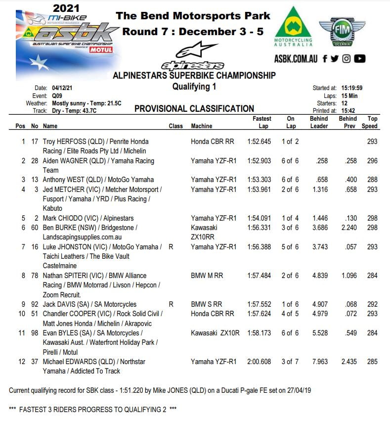 Place désormais aux qualifications, après une séance chrono matinale déjà impressionnante. Lors de la Q1, Troy Herfoss, Aiden Wagner et Anthony West tirent le mieux leur épingle du jeu et se hissent en Q2.