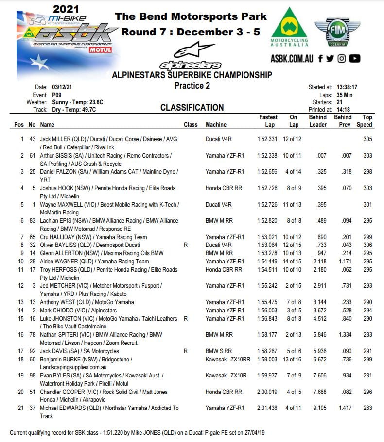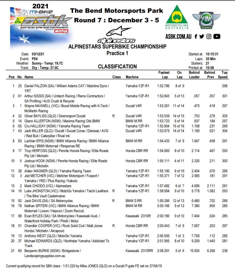Au classement cumulé, Wayne Maxwell a terminé la première journée en tête devant Arthur Sissis et Daniel Falzon, tandis qu’Oli Bayliss est remonté quatrième. Jack Miller n’a pas pu améliorer son chrono et pointe cinquième au cumul des temps. Glenn Allerton place sa BMW à la sixième position, suivi de près par la Yamaha de Cru Halliday. Josh Hook n’a pas non plus pu améliorer son chrono, et est quant à lui huitième.