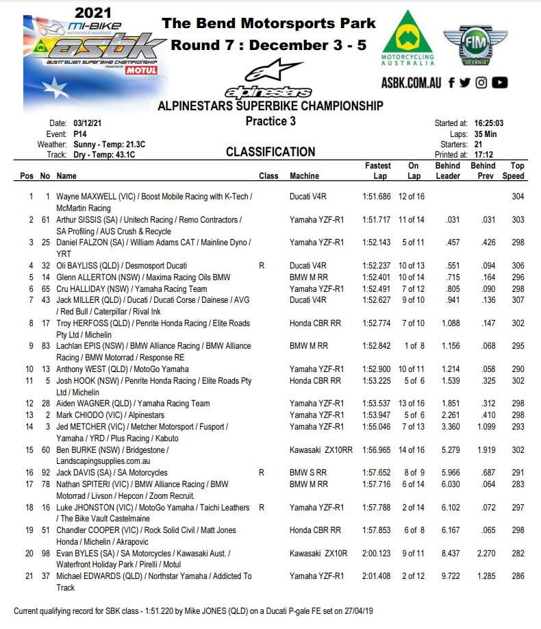 Wayne Maxwell a ensuite amélioré son chrono, réalisé en 1’52.249, repoussant Jack Miller à la septième place des classements combinés. Arthur Sissis était ensuite à nouveau plus rapide, en 1’51.717, avec cinq minutes restantes dans cette FP3 pour battre ce nouveau chrono de référence. Et Wayne Maxwell, le leader du championnat, a réalisé un temps de 1’51.686 a repris la tête du classement dans les dernières minutes à son rival Arthur Sissis.