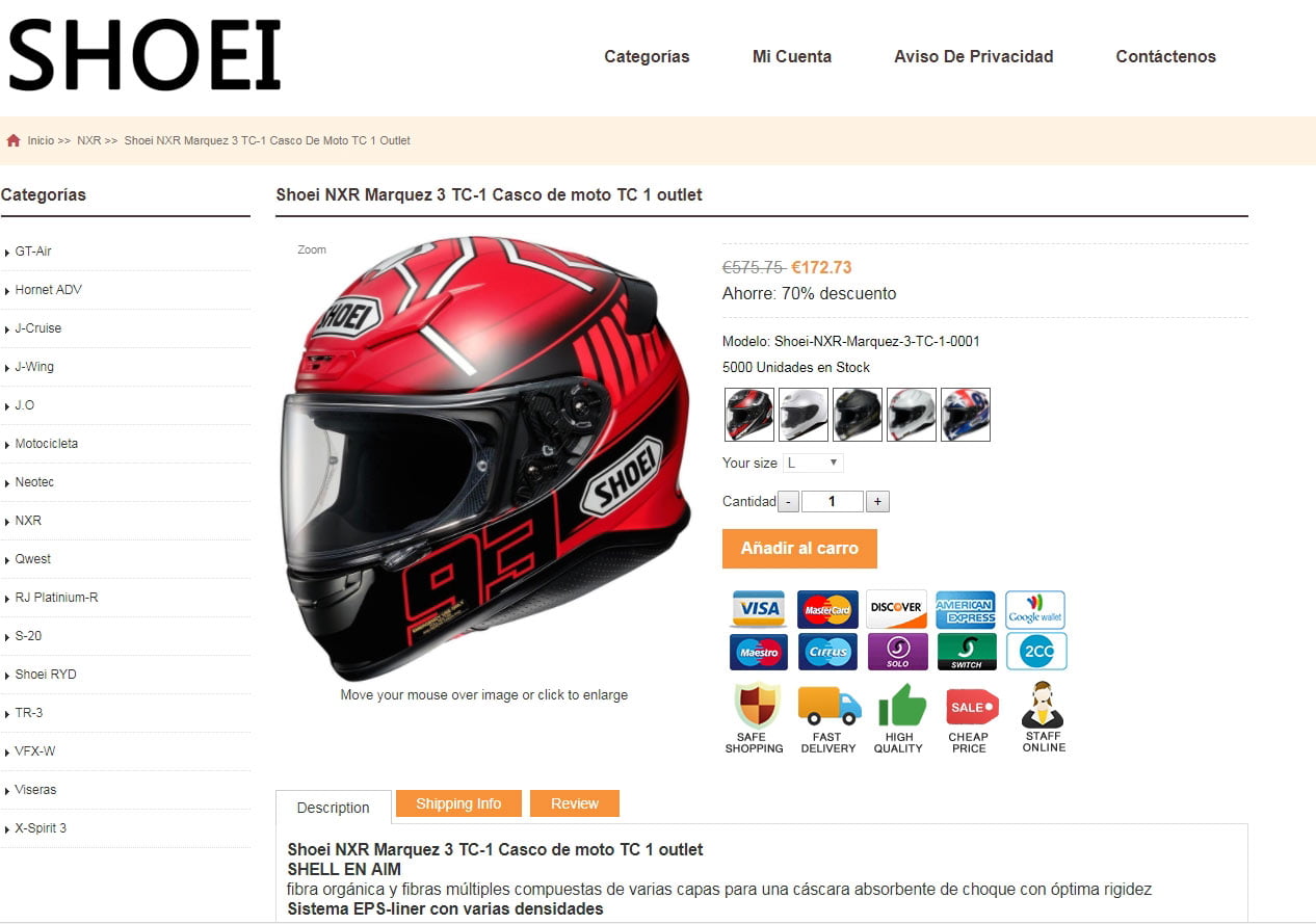 Malheureusement Shoei Espagne a également souffert de cette pratique mise en œuvre par le biais d’un site Web totalement faux appelé www.shoeiespaña.es. Ce site fait de la publicité pour nos casques avec des photos officielles et des prix très bas qui peuvent inciter de nombreux clients à l’achat. Le client qui fait l’achat reçoit un paquet avec un contenu qui n’a rien à voir avec ce que vous avez acheté, dans ce cas, des casques en provenance de Chine avec une valeur de 10 €. Lorsque le client veut réclamer, il ne trouve pas où le faire et s’il veut annuler le débit sur sa carte de crédit, il doit retourner un produit qu’il ne possède vraiment pas.