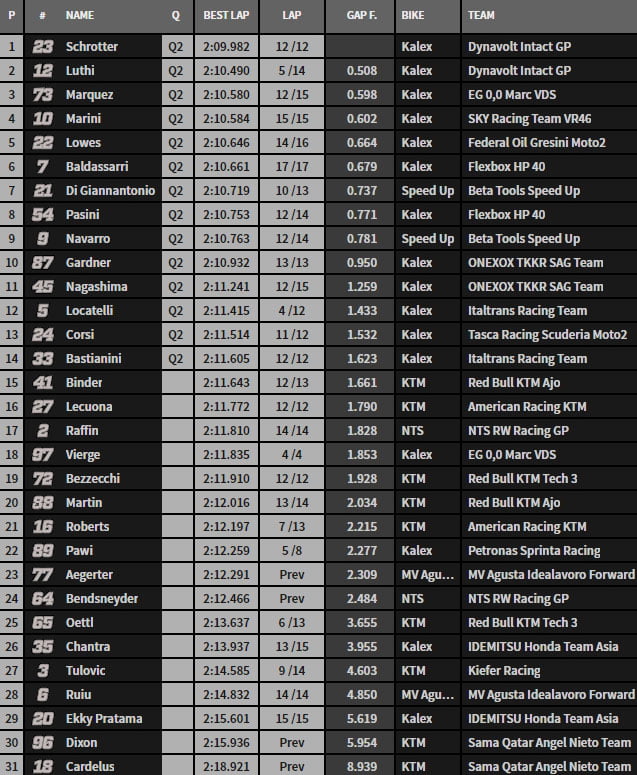 Álex Márquez colle Lüthi à 90 millièmes et Lowes entre dans le trio de tête. Mais dans la dernière minute, Schrötter claque un 2’10.221 qui nous refait le coup du doublé Dynavolt de la première séance. Marini arrache le quatrième temps sous le drapeau à damiers. La déception est pour Vierge qui se retrouve hors du top 14. Schrötter en termine avec un 2’09.982. Il met son équipier à une demi seconde. Chez KTM, c’est la catastrophe. Elles devront potentiellement toutes en passer par la Q1…