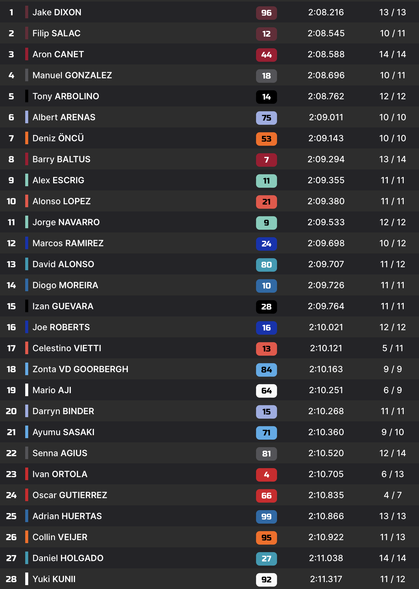 Au moment où il est question d’aller chercher les derniers dixièmes pour signer un chrono, Jake Dixon reprend la main. Le Britannique réaffirme sa domination en tournant en 2:08.479. Devant le drapeau à damier, il frappe encore plus fort, et assomme la concurrence d’un chrono en 2:08.216. Un chrono qui commence à se rapprocher de la pole de l’an dernier, signée en 2:07.631 par Aron Canet