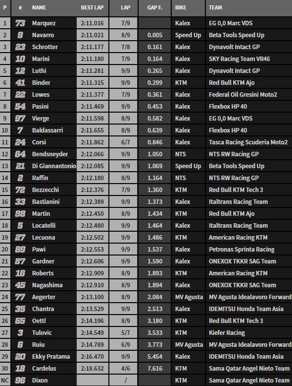 On en restera là. Navarro est second, Schrötter un discret troisième, Marini et Lüthi ferment le top 5. à la KTM de Binder. Bezzecchi, le pilote Tech3 pointe quinzième. Sam Lowes finit son travail par terre au virage 16… Il est septième et il était dans un ultime tour rapide.