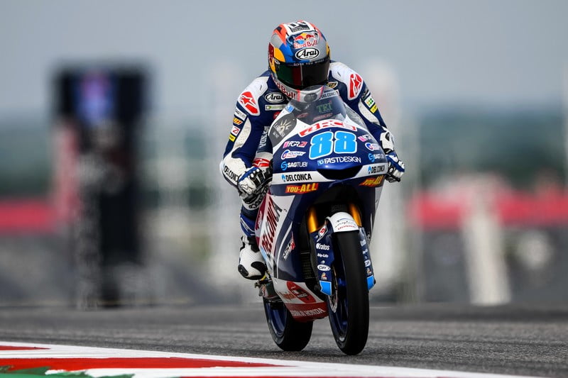 Il fait moins chaud que prévu, 17 degrés dans l’air et 23 degrés en piste, lorsque les feux rouges s’éteignent et que les pilotes Moto3 s’élancent pour les 17 tours de course. Austin fait ainsi partie des Grands Prix raccourcis d’un tour par la Direction de course cette année.