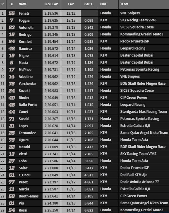 La dernière minute permet à Foggia de porter le curseur à 2’18.649. Mais c’est Fenati qui aura le dernier mot en 2’18.536. Antonelli, Rodrigo, Kornfeil ferment le top 5 qui compte trois Honda et deux KTM.