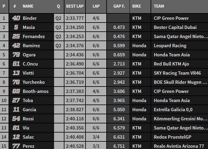 Binder enfonce le clou à quatre minutes du but. Perez chute au virage 15 et il est évacué sur une civière. Masiá grimpe second à deux secondes du leader. Ogura, Öncü tiennent encore leur Q2.