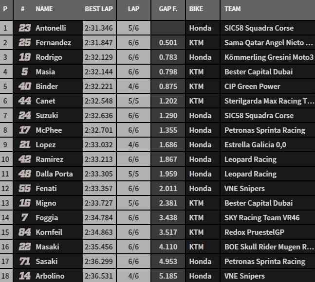 En 2’31.346, Antonelli prend les commandes au Sud Africain. La piste commence à sécher. Les chronos fondent d’autant… Canet chute au virage 7. Il en restera là. Comme Dalla Porta au virage 11. Antonelli décroche la pole position, devant Fernández, Rodrigo, Masiá et Binder. Canet est sixième malgré sa chute. Fenati est seulement douzième.