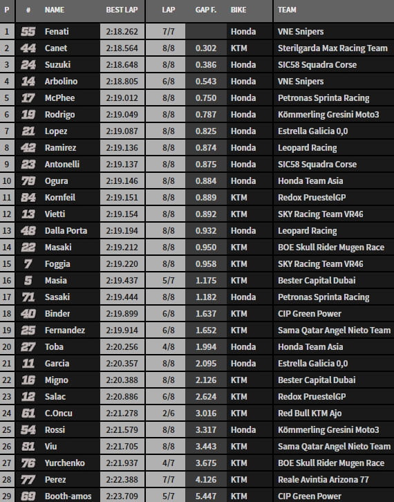 Dans la derrière minute, Fenati claque un 2’18.481 qui lui donne les commandes de la séance. Il s’élancera 12e. Il améliore encore en 2’18.262 pour solde de tout compte.