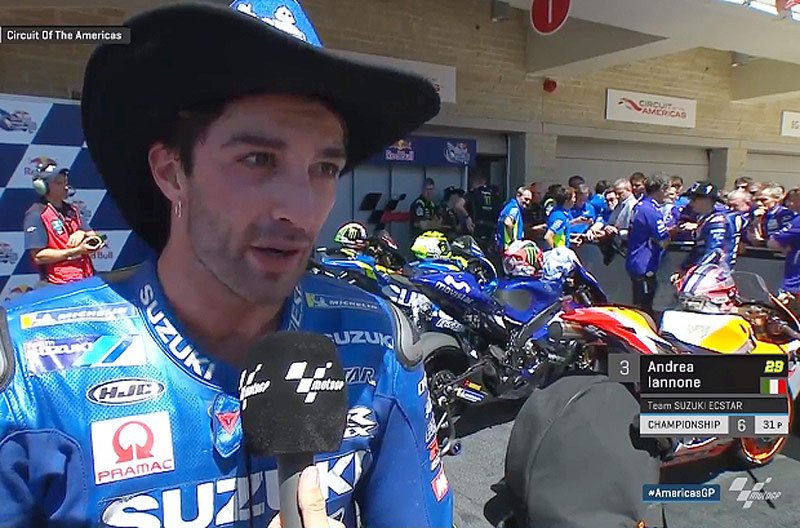 2e sur la grille, 3e l’arrivée, à peine descendu de sa Suzuki GSX-RR, Andrea Iannone s’est confié avec plaisir à la caméra du site officiel MotoGP.com après avoir remporté son premier podium pour la firme d’Hamamatsu.