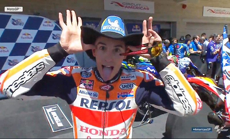 Personne n’en doutait vraiment mais Marc Márquez l’a fait : 6e victoire consécutive à Austin en MotoGP ! À peine descendu de sa Honda RC213V d’usine, le pilote espagnol a essayé de partager son plaisir à la caméra du site officiel MotoGP.com malgré les nombreux sifflets du public présent.