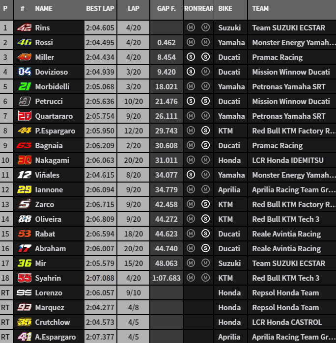 Rins cravache et repousse Rossi à une demi seconde en un tour. Du coup, Dovizioso, quatrième, est en tête du championnat, devant Rossi et Rins. Qui est en mesure d’offrir à Suzuki sa première victoire depuis Silverstone 2015 et Viñales. Dovizioso est revenu à1s8 de Miller. Consignes d’équipe ?