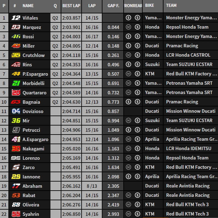 Le classement pré-qualifie provisoirement Marc Márquez, Maverick Vinales, Jack Miller, Cal Crutchlow, Andrea Dovizioso, Alex Rins, Aleix Espargaro, Valentino Rossi, Franco Morbidelli et Fabio Quartararo pour la Q2 au terme du 2e run.