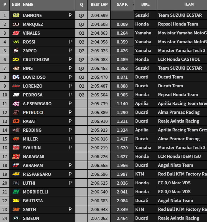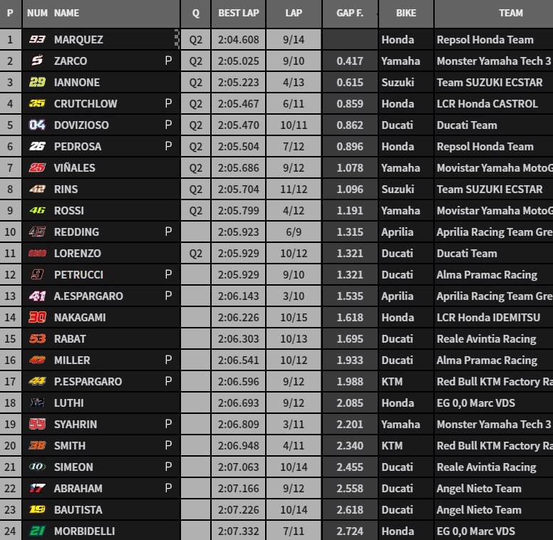 | FP2 | 2’04.061 Marc Marquez | 2’04.599 Andrea Iannone (Voir ici) |