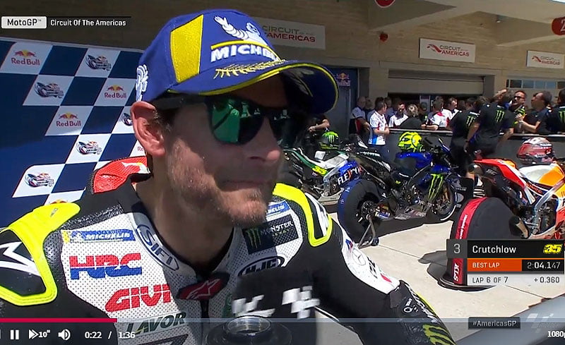 A peine descendu de sa Honda RC213V semi-officielle du team LCR Honda après avoir obtenu la 3e position lors de la qualification du Grand Prix des Amériques, Cal Crutchlow s’est confié devant la caméra du site MotoGP.com avec son humour habituel, mais prudent après sa mésaventure argentine...