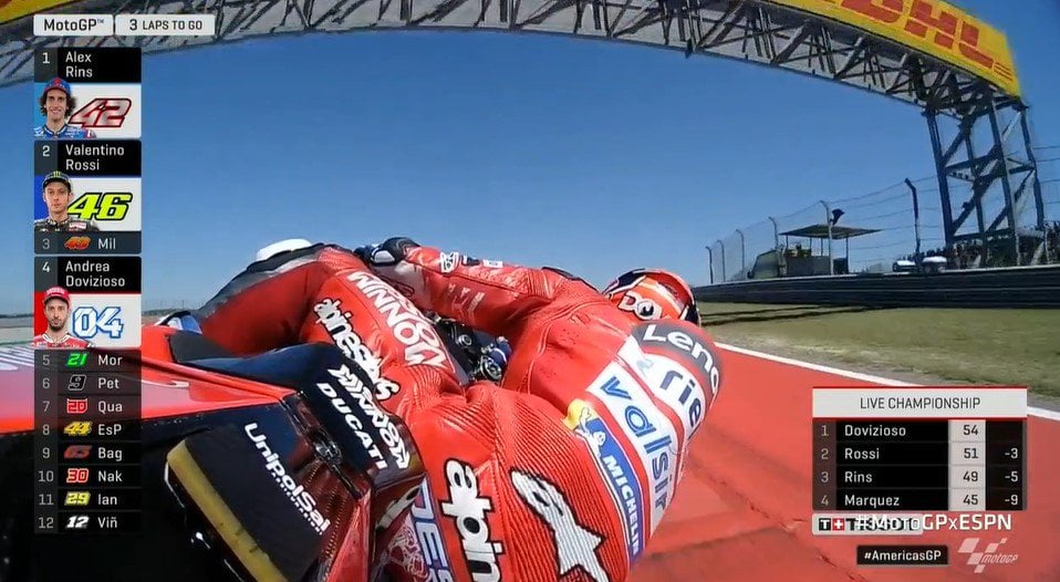 Car ce Grand Prix des Amériques aura été un cimetière Honda. Crutchlow, Márquez et Lorenzo, pour des raisons techniques, n’ont pas vu le drapeau à damiers. Pendant ce temps, Miller grimpait sur le podium, Dovizioso marquait 13 précieux points et Petrucci frôlait le top 5. Dès le départ, les choses se plaçaient favorablement pour DesmoDovi qui explique : « le matin, je me suis bien réveillé, j’étais prêt à me battre. Mon départ a été tellement bon. La piste était vide devant moi ! J’ai été capable de faire tout ce que j’avais prévu jusqu’au premier virage. Et les autres pilotes ont fait exactement ce que je voulais. C’est comme ça que je me suis mis dans une position parfaite. J’ai pu doubler deux autres pilotes dans le premier tour. Je n’aurais pas pu imaginer une meilleure phase de démarrage. Mais au début, la vitesse n’a pas été suffisante pour entrer dans le groupe qui se battait derrière Marc. C’est pourquoi j’ai raté le podium. Notre système d’aide au démarrage a rendu les choses plus faciles, j’en suis très heureux ».