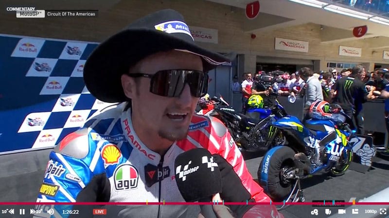 A peine descendu de sa Ducati semi-officielle du team Pramac Racing après avoir obtenu une très solide 3e place lors du Grand Prix des Amériques, Jack Miller s’est confié devant la caméra du site MotoGP.com, heureux et aphone…