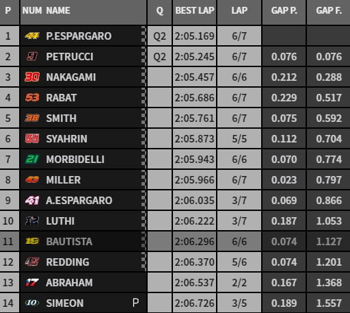 Pol Espargaro passait en deuxième position en 2’05.901, à 0.012 de Syahrin. Petrucci conservait la troisième position devant Bradley Smith et Alex Espargaro. Les 8 premiers étaient groupés en trois dixièmes.