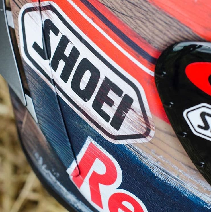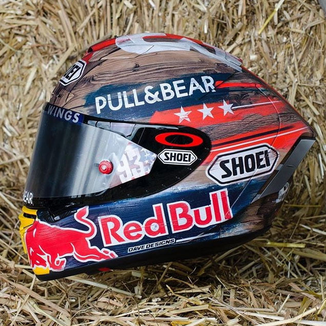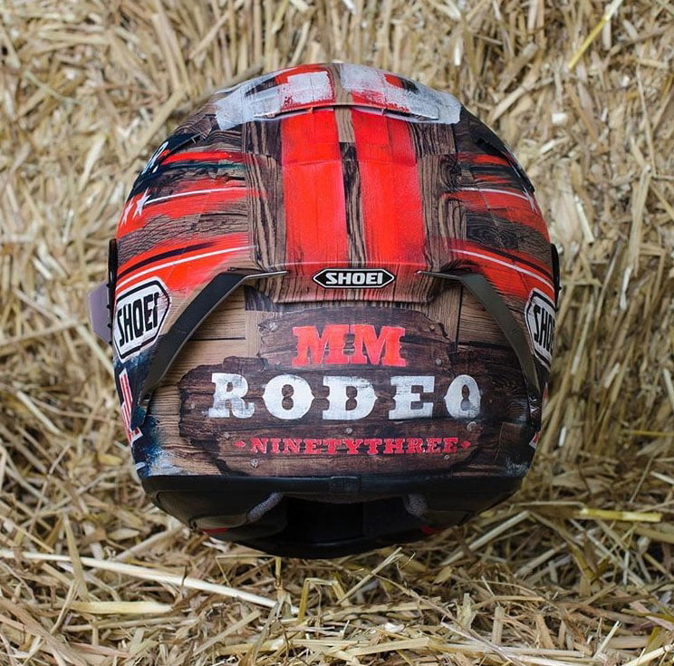 « Il est toujours amusant de concevoir ces casques spéciaux avec Marc et nous apprécions vraiment chaque nouvelle idée. Ce design était dans la tête de Marc depuis deux saisons et c’était maintenant un bon moment pour le concrétiser », a déclaré David Mata de Dave Designs. « Avec la conception de ce casque, nous avons cherché à reprendre avec précision la texture du vieux bois peint, caractéristique des ranchs américains, et c’est pourquoi nous avons décidé d’essayer de nouvelles techniques pour y parvenir, en utilisant la peinture traditionnelle à l’aérographe et à la main. »