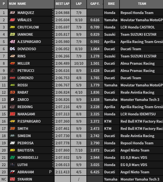 | FP2 | 2’04.061 Marc Marquez | 2’04.599 Andrea Iannone (Voir ici) |