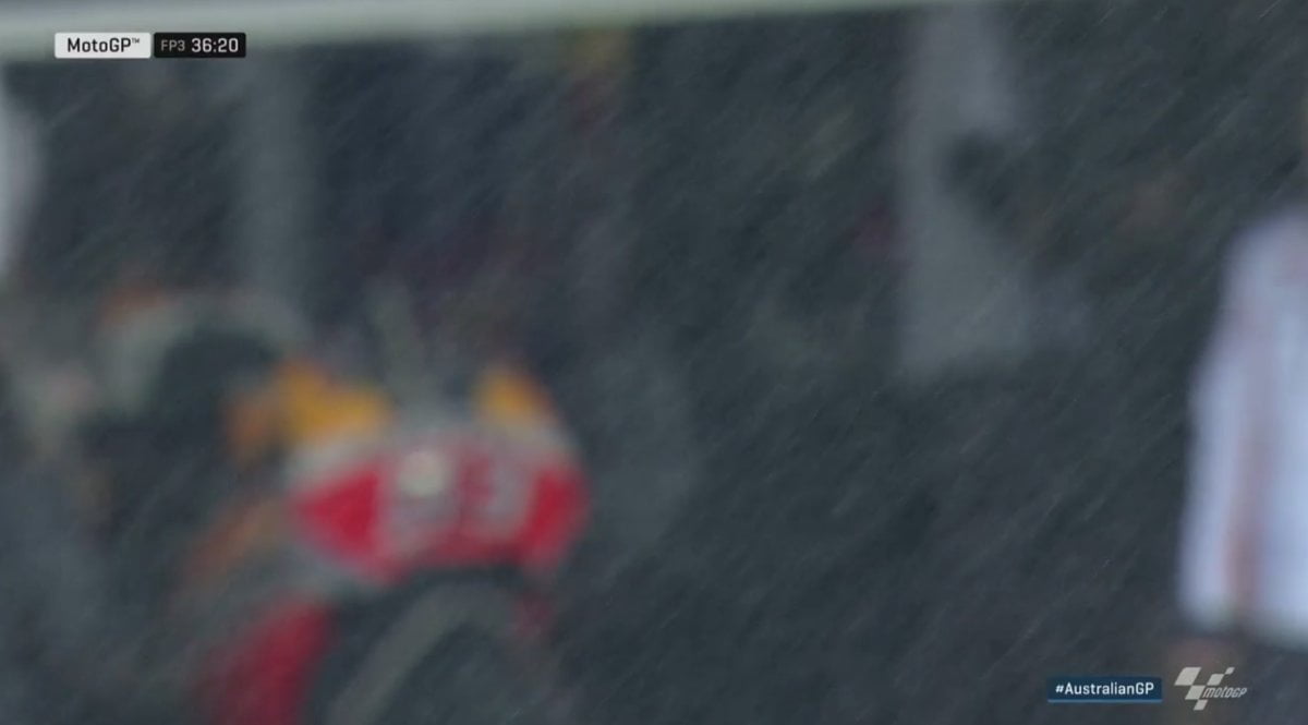 Néanmoins, quelques pilotes dont Marc Márquez, Jack Miller, Dani Pedrosa, Jorge Lorenzo, Andrea Iannone et Loris Baz pour tester l’adhérence du bitume australien alors qu’au contraire, Valentino Rossi, Andrea Dovizioso, Maverick Vinales et Johann Zarco préfèrent rester dans leur box en espérant que les conditions s’améliorent.