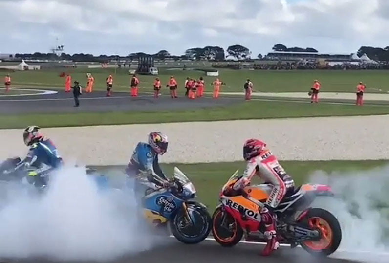 Du coup, Marc Márquez décide de le bloquer, mais le pilote australien ne se laisse pas faire et entame une partie de burn !