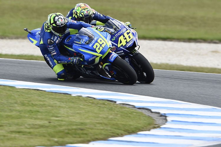 Chez Suzuki, on avait de quoi se réjouir d’un Grand Prix d’Australie qui succédait à un bon Grand Prix du Japon. Une fois encore, les GSX-RR avaient réussi un beau résultat d’ensemble. Sixième pour Iannone parti quatrième et huitième pour un Rins qui s’était élancé treizième. Pas mal, mais Joe le Maniac s’est aussi révélé sur la piste de Phillip Island. Et Valentino Rossi l’a fait savoir…