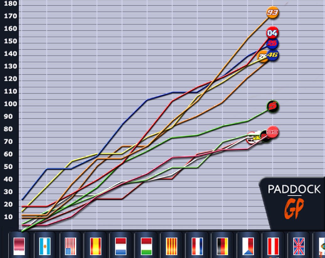 Il s’était aussi adjugé 41 pole positions en 82 participations depuis son arrivée en MotoGP. Le Catalan a de fait dominé les qualifications un coup sur deux. Ce pourcentage chute à 23,5 % pour Jorge Lorenzo, 18,1 % pour Valentino Rossi et 15,7 % pour Dani Pedrosa. Une statistique qu’il améliorait encore en portant son nombre total de position de pointe à 70.