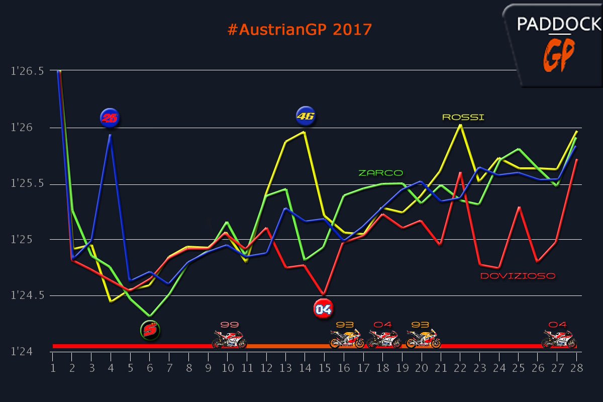 Ensuite, peu à peu, le rythme décroît mais on ne constate aucun gros écart de chronos, la perturbation du 13e tour étant liée au dépassement de Valentino Rossi et à l’attaque de Dani Pedrosa sur le pilote Tech3.