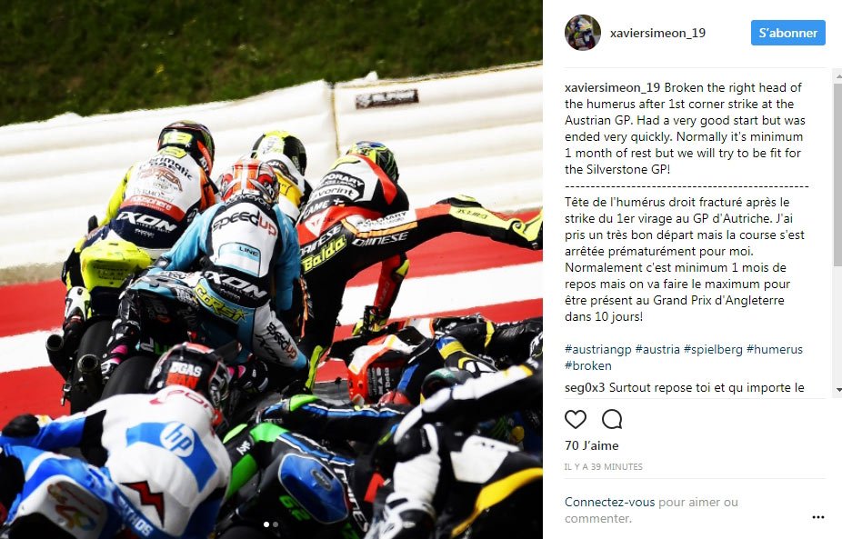 Xavier Siméon : « Tête de l’humérus droit fracturé après le strike du 1er virage au GP d’Autriche. J’ai pris un très bon départ mais la course s’est arrêtée prématurément pour moi. Normalement c’est minimum 1 mois de repos mais on va faire le maximum pour être présent au Grand Prix d’Angleterre dans 10 jours! »