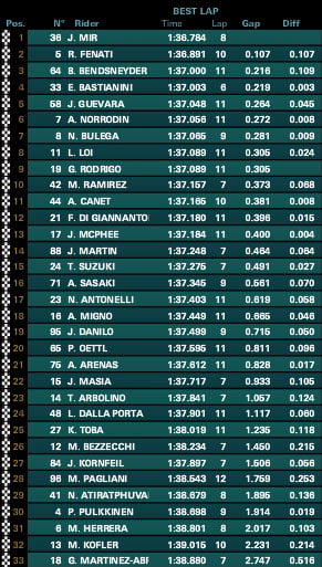 L’emballage final voit une petite dizaine de pilotes allumer le premier secteur en rouge , mais si chacun améliore son propre chrono, personne ne viendra contester la suprématie du pilote Leopard Racing, et, comme par hasard, on retrouve après le drapeau à damier Joan Mir devant Romano Fenati.