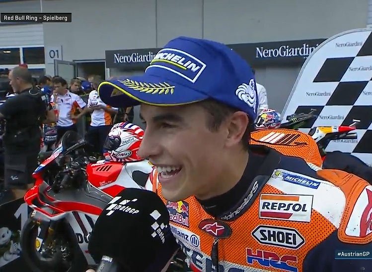 A peine descendu de sa Honda RC213V officielle après avoir rallié l’arrivée du Grand Prix d’Autriche en 2e position au terme d’attaques de folie sur Andrea Dovizioso, Marc Marquez s’est confié au micro du site MotoGP.com.