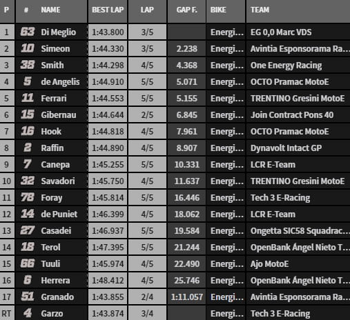 Alors que la qualification des MotoE, disputée sous un franc soleil, a vu Mike Di Meglio se révéler le plus rapide, c’est maintenant sur un asphalte bien humide que va se dérouler la course réduite de 8 à 5 tours des motos électriques. Ceci étant censé expliquer cela, bien qu’on n’en comprenne pas bien la raison…