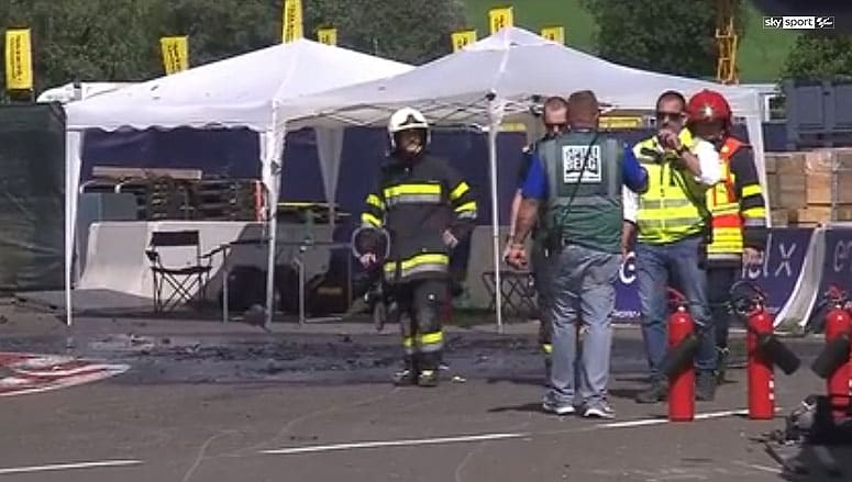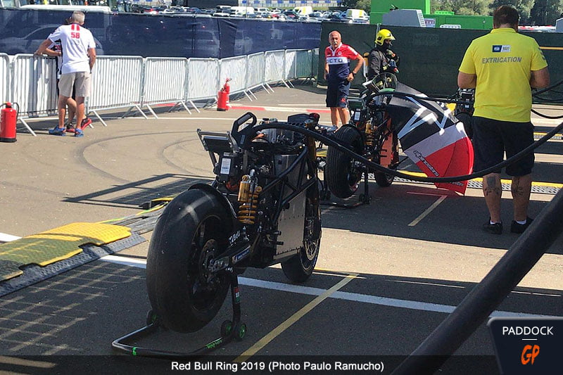 Quoi qu’il en soit, on dès lors a tout de suite commencé à essayer d’endiguer le processus dans le paddock MotoE avant de sortir la moto pour la tracter dans un endroit plus isolé, en l’occurrence de l’herbe, afin d’éviter un désastre complet comme à Jerez. Les pompiers (il y en a toujours au moins deux dédiés à cette tâche) ont alors commencé à arroser la moto, non pas pour éteindre le feu (un feu de batterie Lithium-Ion ne s’éteint pas avant la combustion complète), mais pour tenter de refroidir la batterie, seul éventuel moyen d’endiguer l’emballement thermique.