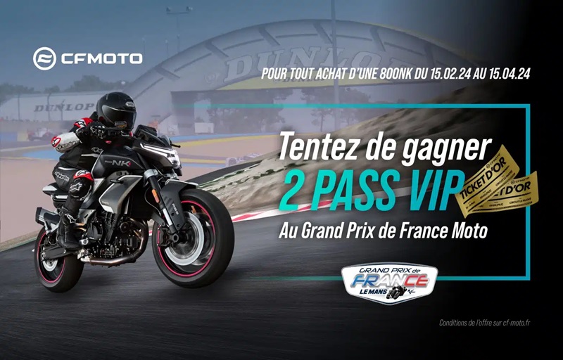 Pour participer, commandez votre 800NK Sport ou Advanced à prix préférentiel entre le 15/02/24 et le 15/04/24 dans une concession CFMOTO, et remplissez le formulaire donné lors de l’achat de votre moto pour avoir une chance de vous rendre sur place pendant tout le week-end du Grand Prix. sarthois