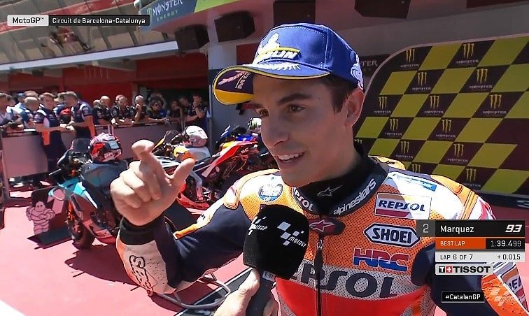 A peine descendu de sa Honda RC213V officielle après avoir obtenu la 2e place sur la grille du Grand Prix de Catalogne sur le circuit de Barcelona – Catalunya, Marc Márquez s’est confié devant la caméra du site MotoGP.com avec la satisfaction du devoir accompli.