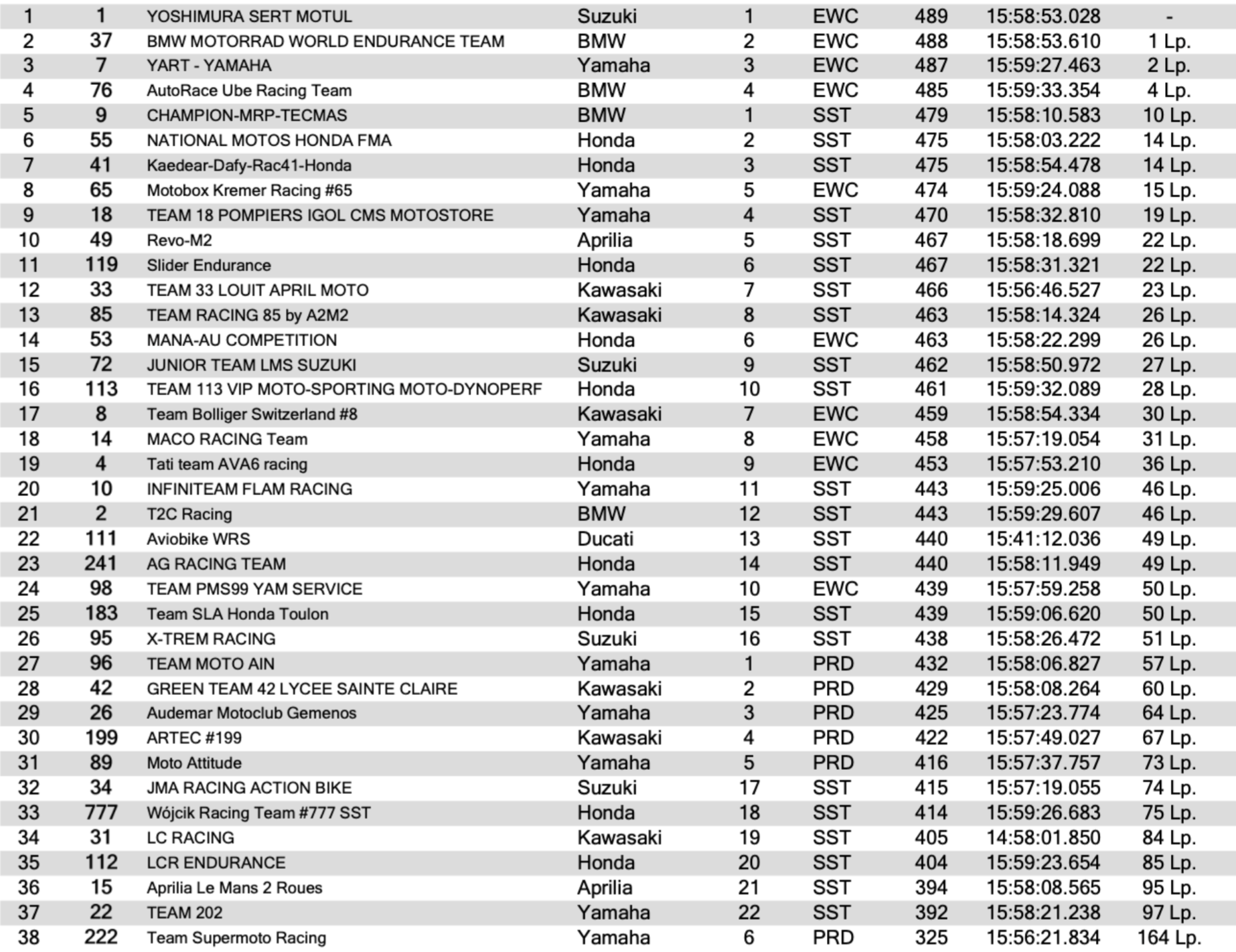 Derrière le tiercé leader, AutoRace Ube Racing Team impressionne pour ses débuts en maintenant la 4e place. La Kawasaki Webike Trickstar, après une nuit héroïque sans Mike Di Meglio, a finalement jeté l’éponge à l’aube après être remonté aux avant-postes. La Honda No Limits et la 3ART Best of Bike abandonne aussi après un ennui mécanique.