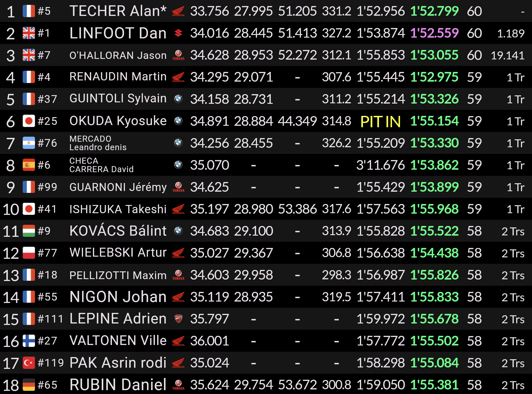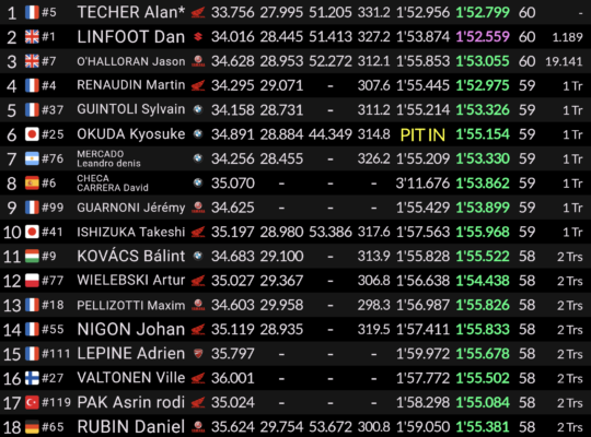 Dans le trio de tête, la Suzuki n°1, consolide sa deuxième position restant au contact du leader. Le trio Yamaha du YART #7 emmené par Karel Hanika se maintient solidement dans le top 3. Derrière ce podium, la bataille fait rage entre le Tati Team AVA Racing, qui gagne des places pour se hisser au 4e rang, suivi de la solide équipe BMW #37 qui maintient sa place dans le top-5.