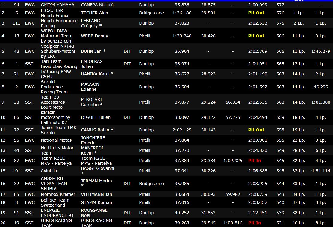 C’est une bagarre somptueuse qui oppose en fin de course la Yamaha du GMT94 et la CRB1000RR Fireblade de FCC TSR Honda France. Les deux machines s’échangent la première position au fil des ravitaillements.