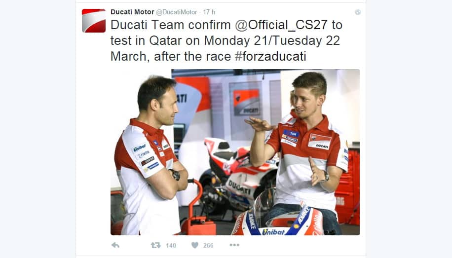 C’est par un simple Tweet de Ducati Motor que Gigi Dall’Igna a confirmé que Casey Stoner roulerait les lundi 21 et mardi 22 mars sur le circuit de Losail, soit à le lendemain du Grand Prix.