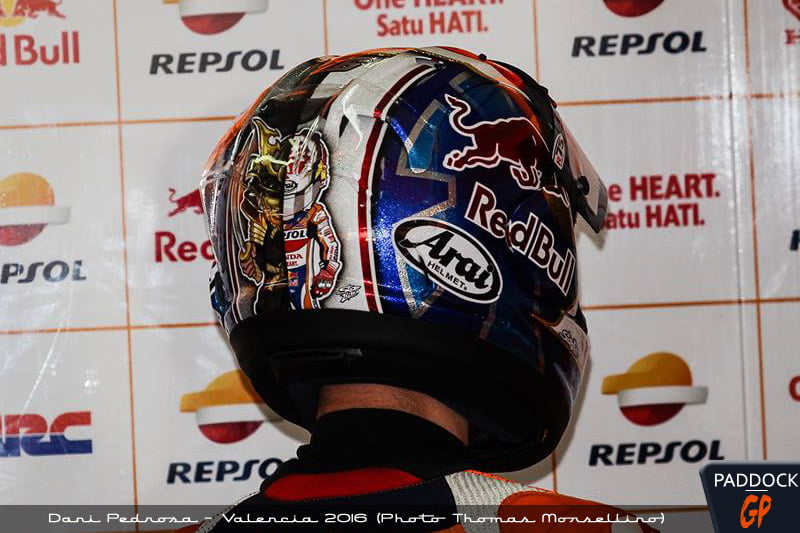 Depuis ce matin à Valencia, Dani Pedrosa utilise une nouvelle décoration de casque incluant un SamouraÏ et une finition pailletée.