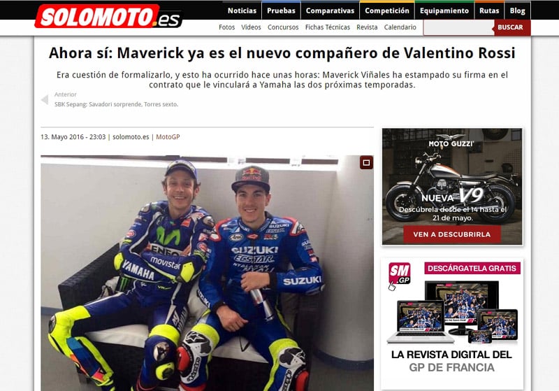 Souhaitant se démarquer de l’ensemble de la presse internet, le site espagnol Solomoto annonce noir sur blanc que Maverick Vinales a signé son contrat chez Yamaha hier.