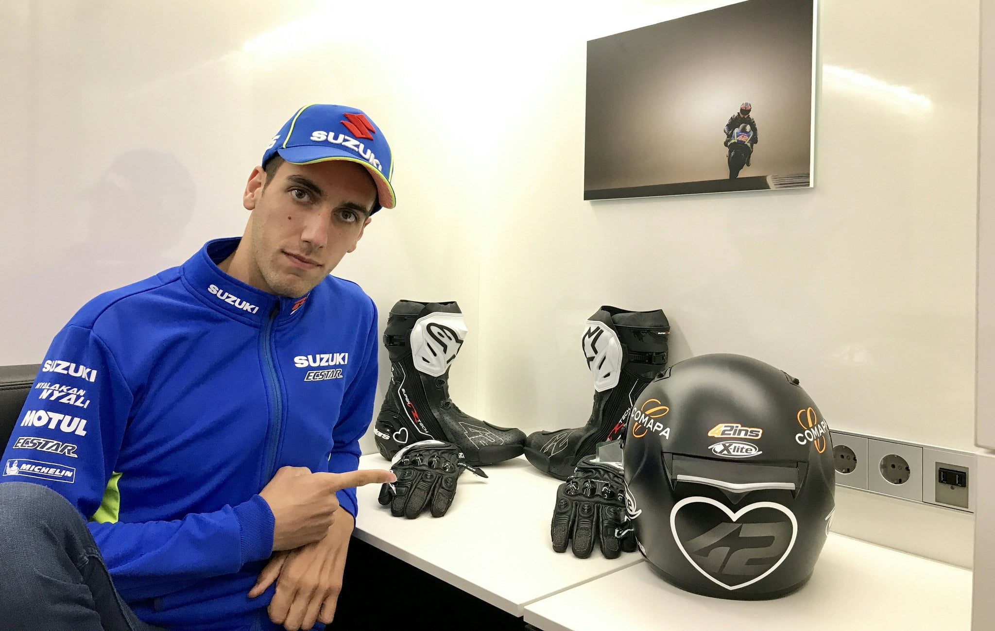 …Cette fois c’est Alex Rins qui témoigne de son soutien à sa ville natale, Barcelone, récemment touchée par une attaque terroriste la semaine dernière. Pour de Grand Prix de Grande Bretagne, le pilote Suzuki a choisi de porter gants, bottes et casque majoritairement noirs.