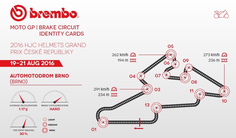 Selon des techniciens Brembo, qui traitent tous les pilotes MotoGP (Brembo fournit 100 % des pilotes dans la catégorie reine), l’Automotodrome de Brno est parmi les circuits les plus exigeants pour les freins.