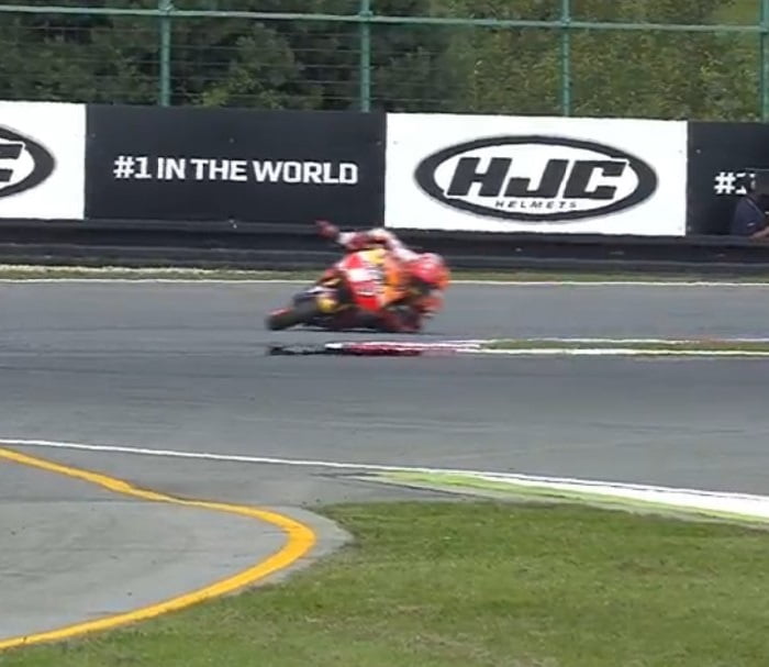 Marc Márquez s’est fait plaisir et nous a fait vibrer durant un exercice qu’il finit avec un cuir râpé de la botte à l’épaule. Cette dernière a été déboîtée il y a une semaine, mais elle a servi d’appui et tout le côté du corps avec, pour redresser dans le T13 du circuit une Honda prête à se coucher après avoir perdu toute adhérence de l’avant. Un rétablissement à couper le souffle.