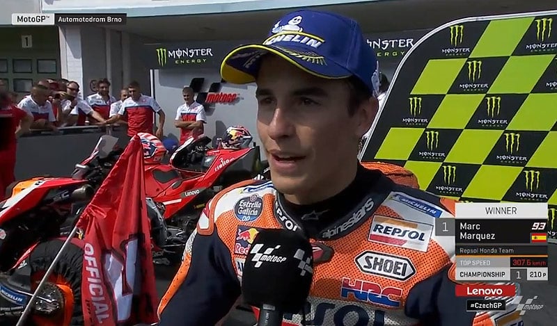 A peine descendu de sa Honda RC213V officielle après avoir remporté le Grand Prix de République Tchèque sur le circuit de Brno, Marc Márquez s’est confié devant la caméra du site MotoGP.com avec la satisfaction du devoir accompli…