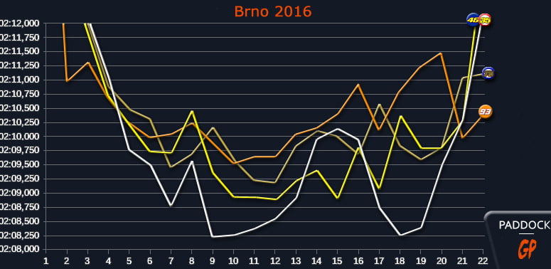 Derrière, Valentino Rossi (Tendre avant/Dur arrière) est un peu moins performant du fait de son pneu avant mais se révèle plus régulier. Il évitera l’erreur de vouloir suivre Crutchlow quand celui-ci le passe au 7e tour (aucune baisse de chrono). Contrairement aux Ducati et à Lorenzo, il n’abîmera pas son pneu avant tendre.